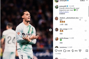 安东尼社媒晒出庆祝的照片,配文:“在客场取得漂亮胜利,继续加油!”