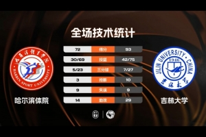 哈尔滨体院:周诗童18分、田浩斌15分5板、王家宁10分、黄钰洁8分6助、张翔8分、武钊文6分、于智文5分、魏小龙2分