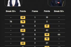 上半场结束墨菲3-1领先范争一,下半场双方战至4-4平,第九局墨菲单杆140分制胜占得先机。